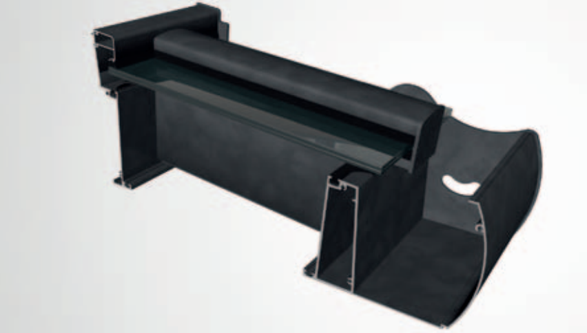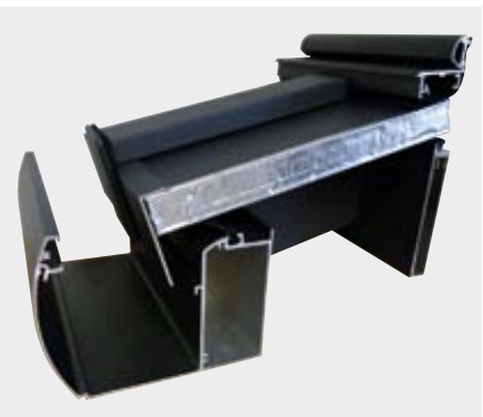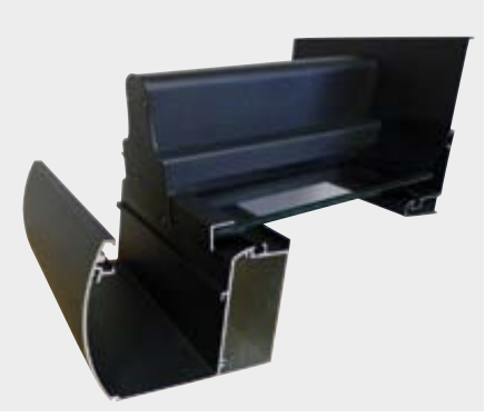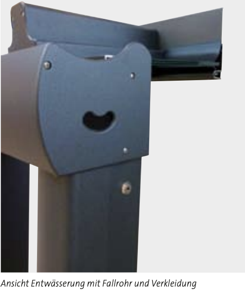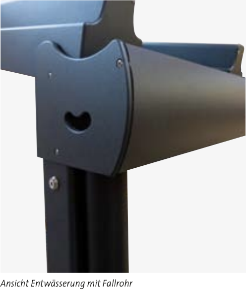 Das System besticht durch seine leicht abgerundete Optik bei den Mittelsparren sowie die runde Form der Rinne (Traufe). Sämtliche Endstücke sind aus 4 mm starkem Aluminiumblech gefertigt und im Randbereich gerundet. Alle Befestigungsschrauben sind aus hochwertigem Edelstahl und werden versenkt verschraubt.